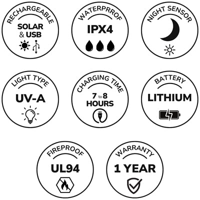• 自動滅蟲功能,內置光感應器,黃昏自動開啟,黎明自動關閉。